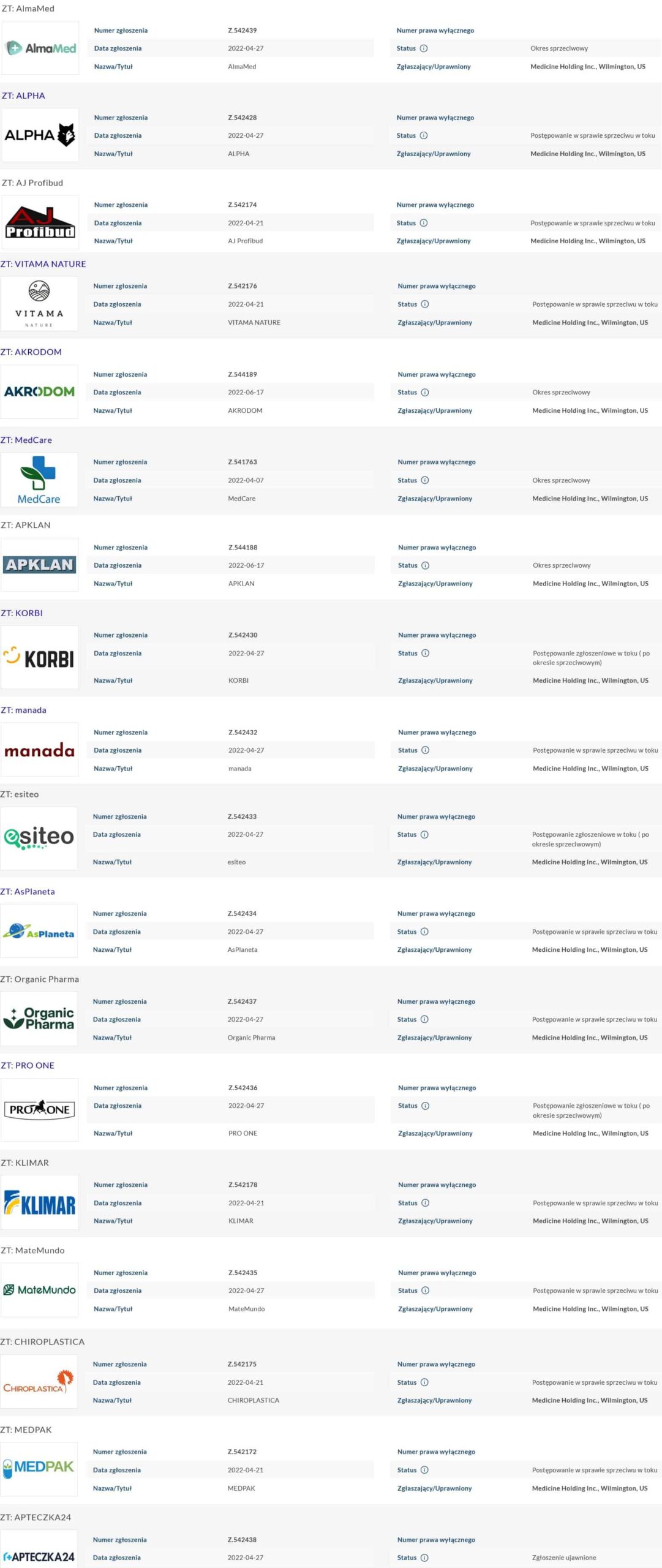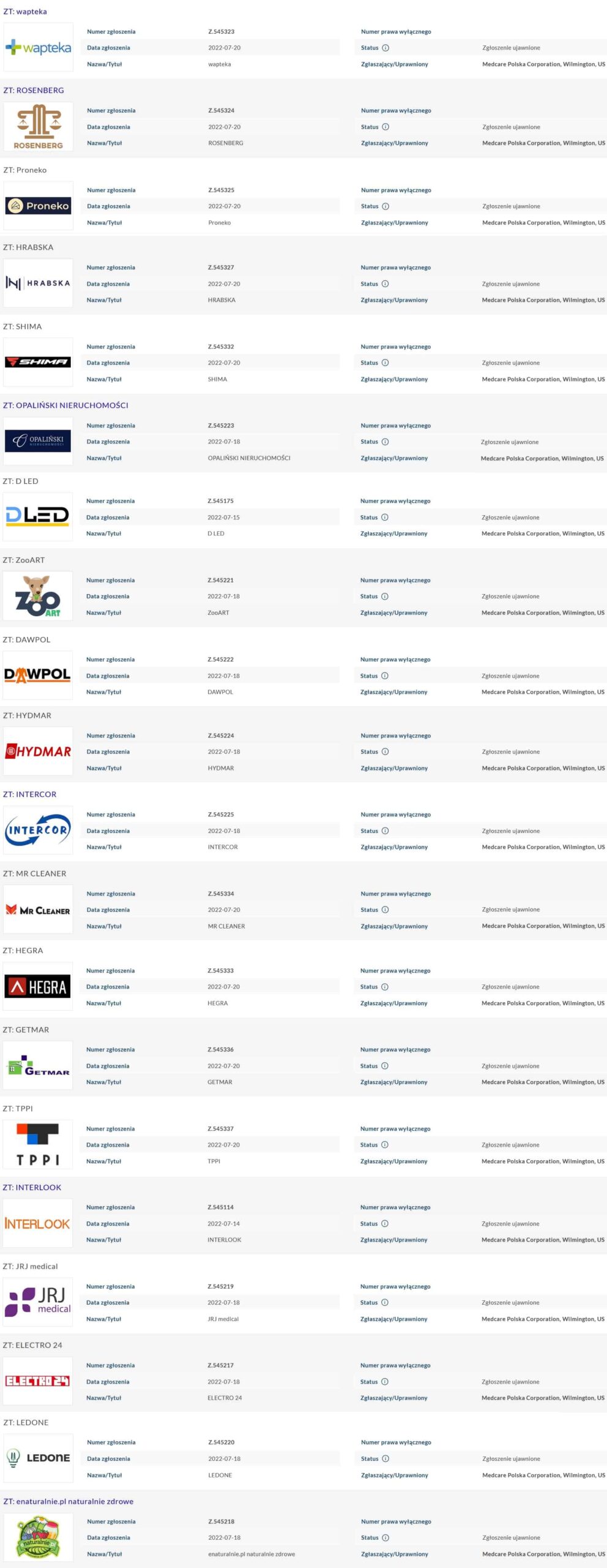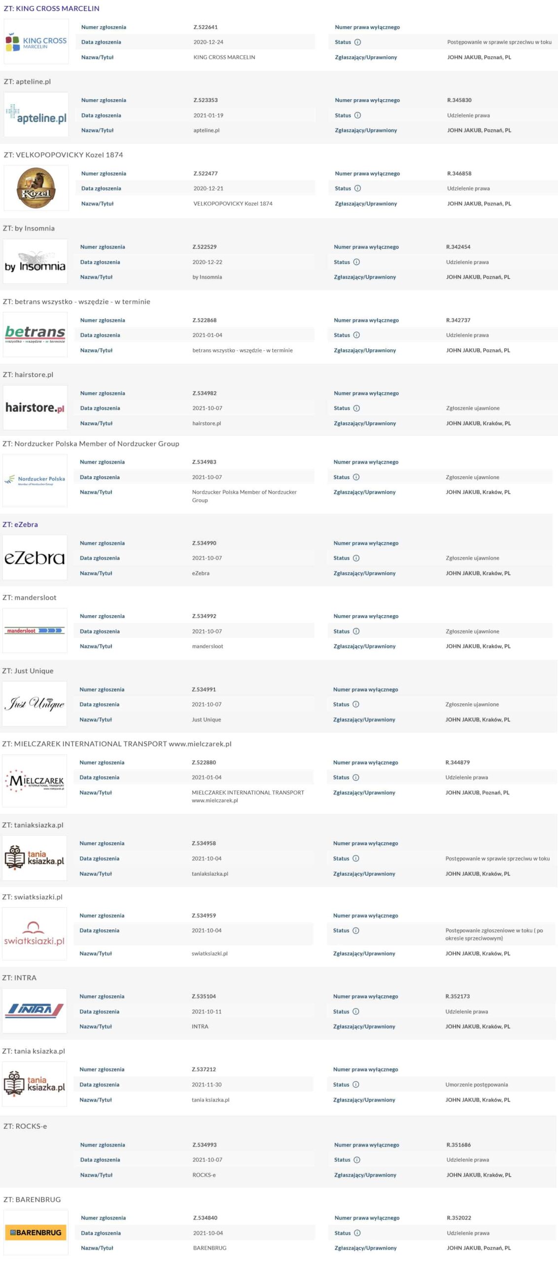 Myślisz, że Tobie to nie grozi? W takim razie spójrz na poniższe screeny z rejestru UP RP. Trzy różne podmioty dokonały hurtowych zgłoszeń cudzych brandów. Wiem to z pierwszej ręki od firm, które z przerażeniem znalazły tam swoje logo.